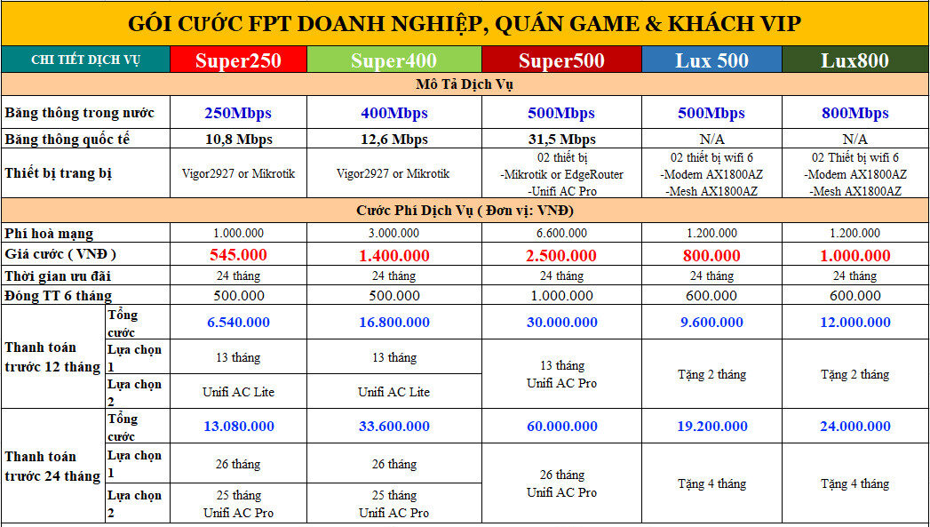 Quý khách hàng có nhu cầu sử dụng Mạng FPT tốc độ cao cho doanh nghiệp tại khu vực Hải Phòng cũng như các cơ sở kinh doanh, quán game khác có thể tham khảo các gói cước siêu nhanh từ 250Mbps – 500Mbps và các chương trình khuyến mãi, băng thông cụ thể như sau: